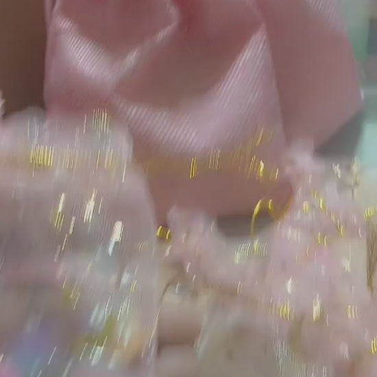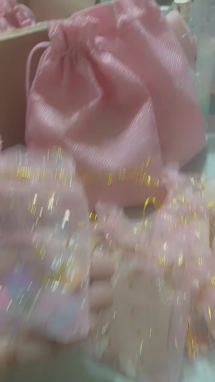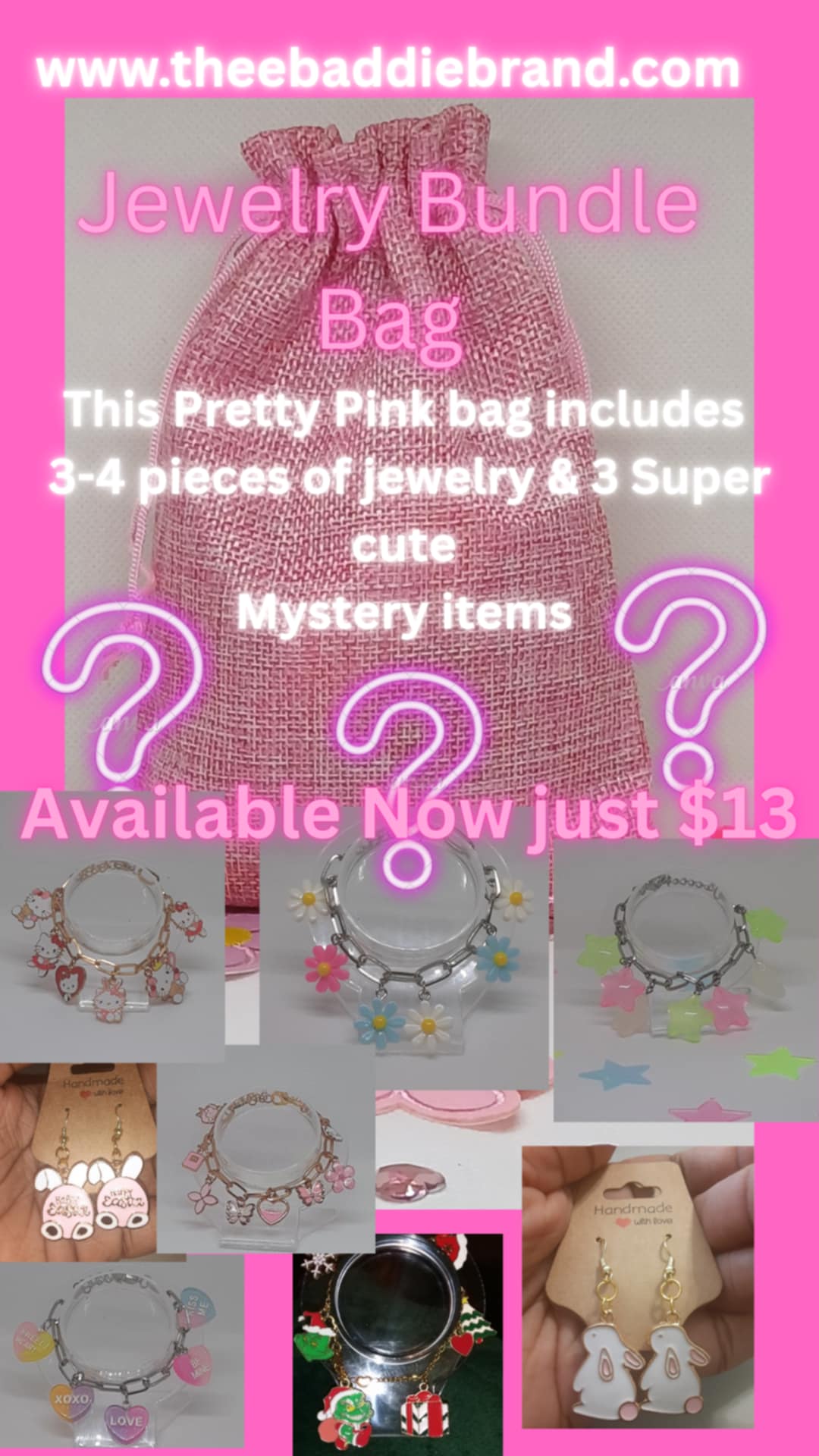 Jewelry Bag pretty pink burlap Bag inside includes 3-4 pieces of handmade jewelry from 2024 ranging between charm bracelets , earrings Also each bags Includes 3 Super Cute Mystery items